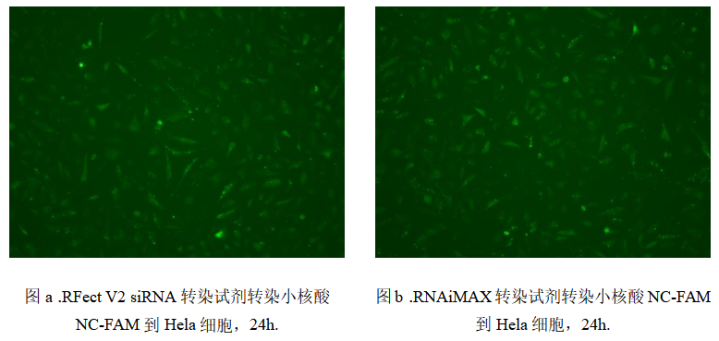转染效率也是该试剂的核心竞争力之一。RFect V2试剂盒中配套研发了专属siRNA转染增强剂,该增强剂通过调节细胞膜表面的电荷分布与受体表达,有效抑制了细胞对异源核酸的免疫排异反应,促进了转染复合物与细胞膜的融合及胞内释放过程。大量实验数据表明,RFect V2在多种贴壁细胞(如Hela、HEK293、BEAS-2B等)中的mRNA敲除效率可高达95%左右,较初代RFect试剂提升了5-30%,并且难能可贵的是,在部分难转染细胞(如Huvec、THP -1等)中也能实现高效转染。在Hela细胞中进行的NC-FAM小核酸转染对比实验显示,RFect V2与RNAiMAX的转染效率均突破90%,在可视化层面呈现出相当的转染效果,证实了其在高效递送方面的性能优势。